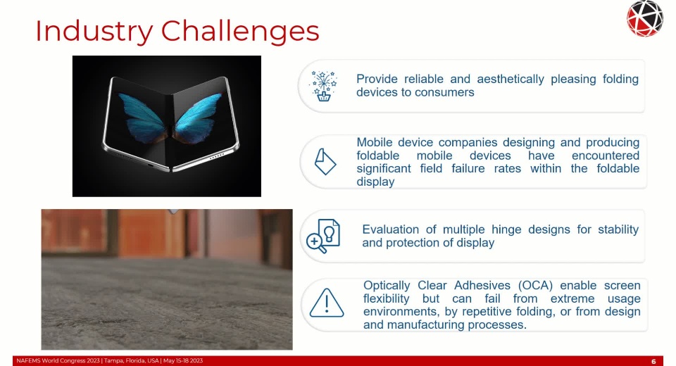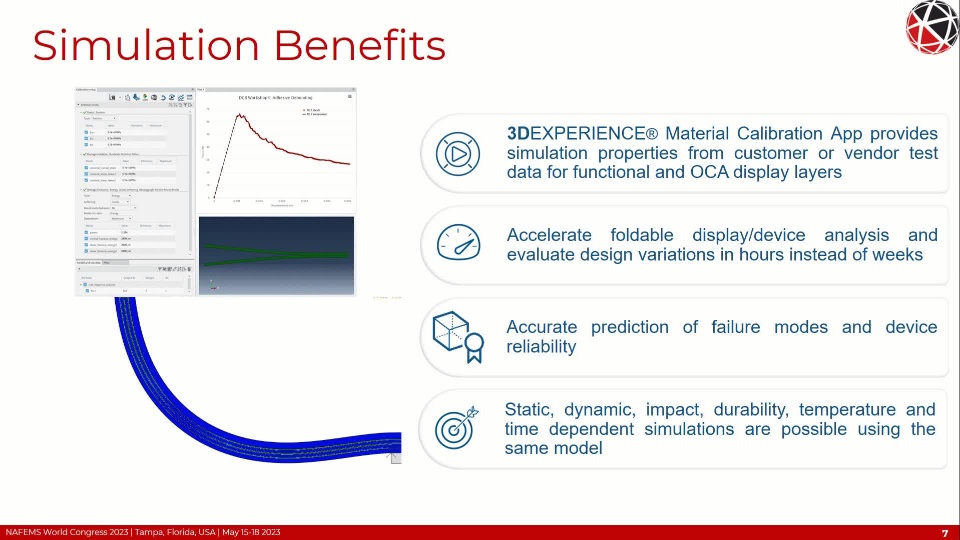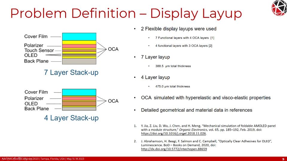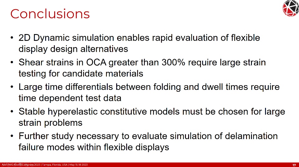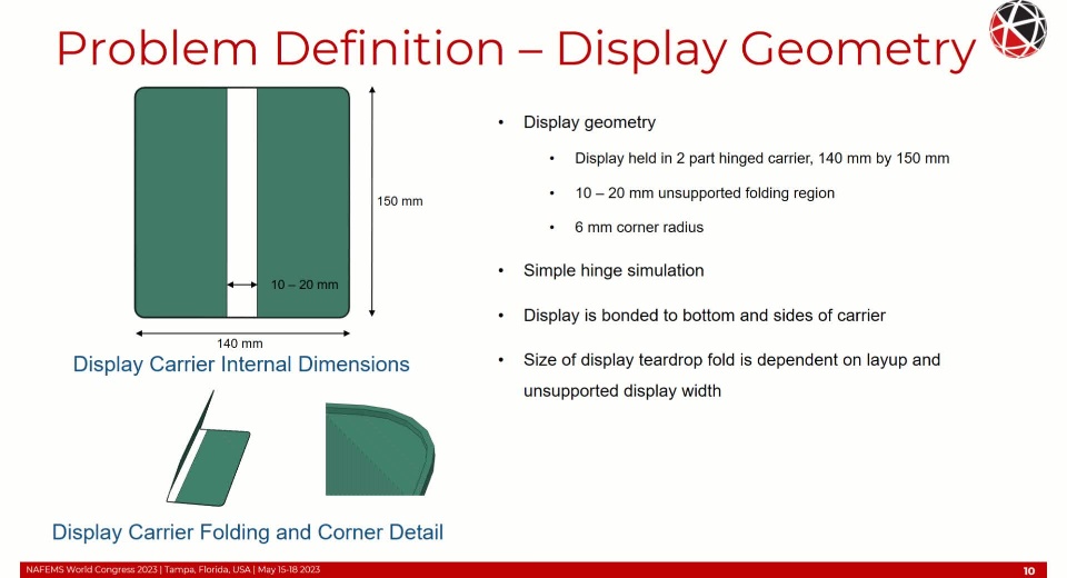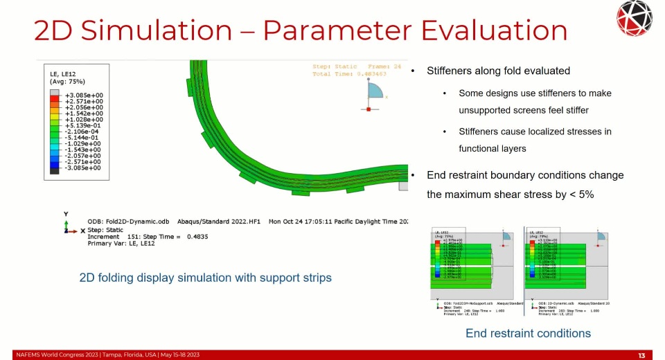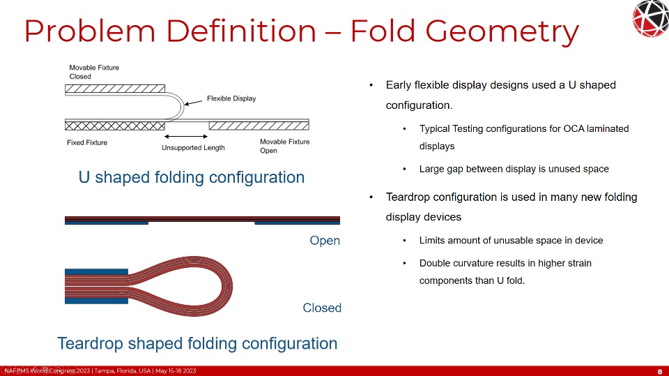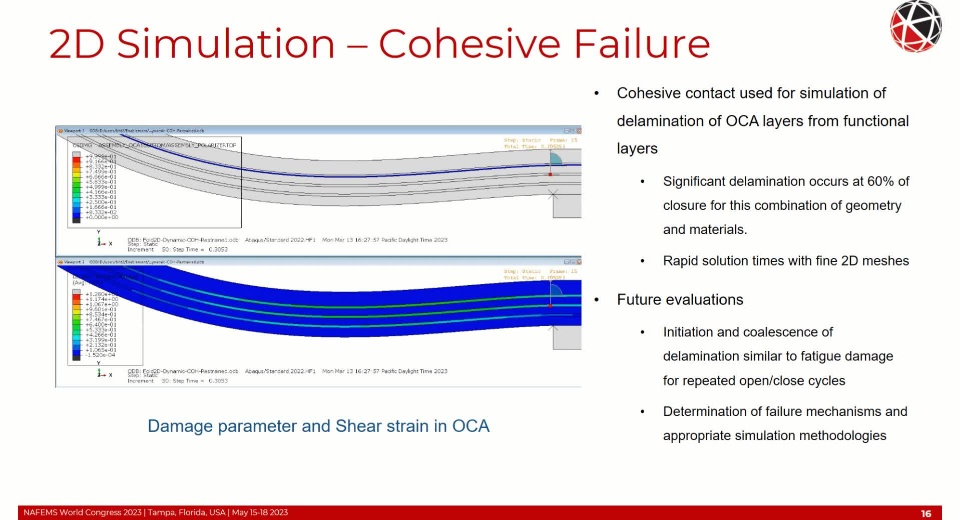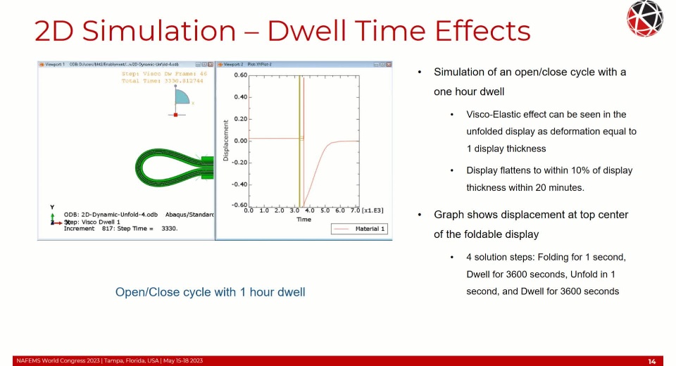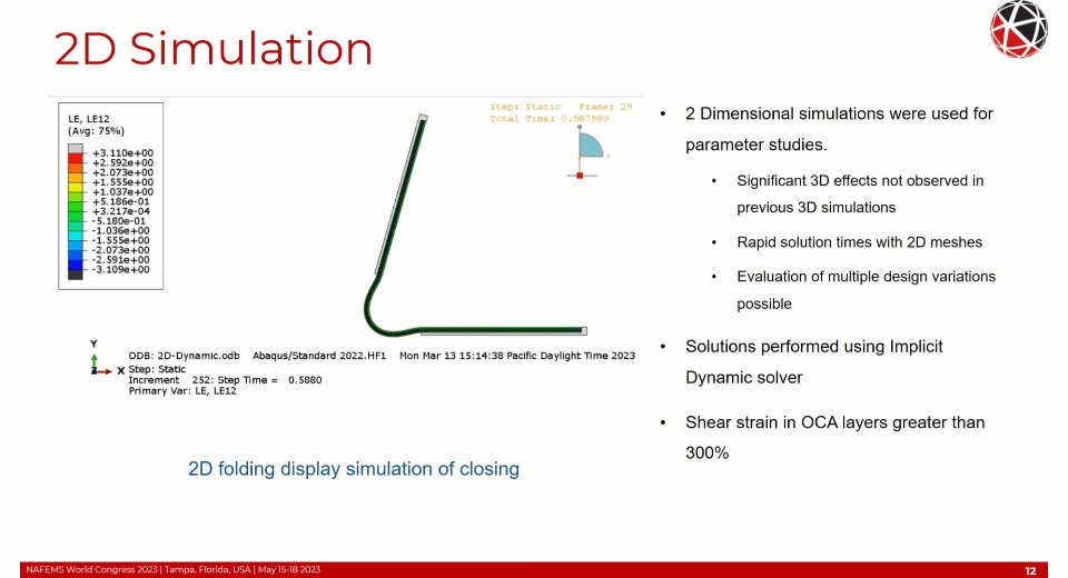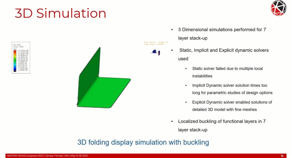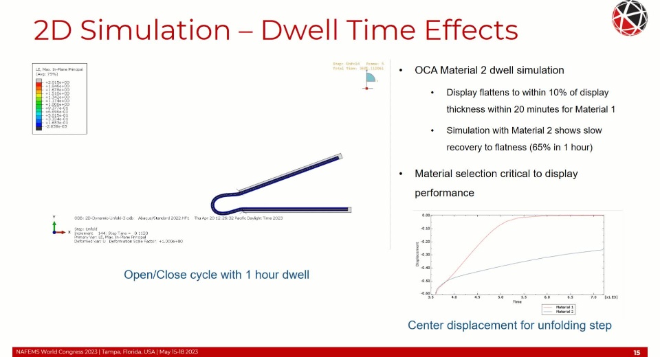 Simulation of a foldable display with FEM is complex requiring non-linear and time-based material behavior, non-linear geometric behavior (local and global buckling/wrinkling), adhesion and cohesion of the OCA, and fracture/failure of the functional component layers. Additional considerations of the FEM formulation such as selection of the objective stress rate with large shear strains and finite rigid body rotations need to be addressed to maintain high solution accuracy. These topics will be covered in detail within this presentation.