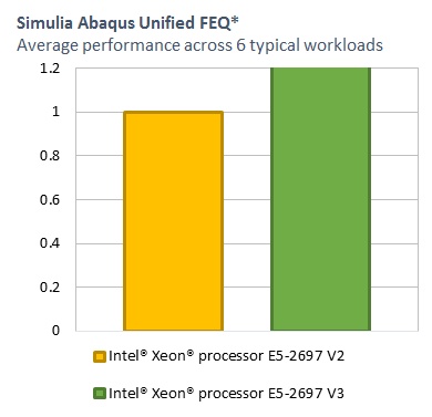 To provide general guidelines, Intel and Dassault Systèmes measured performance for SIMULIA Abaqus FEA across six standard benchmarks that reflect a variety of design scenarios. The results showed an average performance gain of 22 percent for a system based on the latest Intel Xeon processor E5 v3 product family compared with a system running on previous-generation processors.
