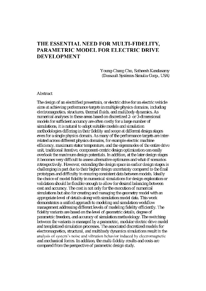 The design of an electrified powertrain, or electric drive for an electric vehicle aims at achieving performance targets in multiple physics domains, including electromagnetics, structures, thermal fluids, and multibody dynamics. As numerical analyses in these areas based on discretized 2- or 3-dimensional models for sufficient accuracy are often costly for a large number of simulations, it is natural to adopt suitable models and simulation methodologies differing in their fidelity and scope at different design stages even for a single physics domain. As many of the performance targets are inter-related across different physics domains, for example electric machine efficiency, maximum stator temperature, and the eigenmodes of the entire drive unit, traditional iterative, component-centric design optimization can easily overlook the maximum design potentials. In addition, at the later design stages it becomes very difficult to assess alternative optimums and what-if scenarios retrospectively. However, extending the design space in earlier design stages is challenging in part due to their higher design uncertainty compared to the final prototypes and difficulty in ensuring consistent data between models. Ideally the choice of model fidelity in numerical simulations for design exploration or validation should be flexible enough to allow for desired balancing between cost and accuracy. The cost is not only for the execution of numerical simulations but also for creating and managing the geometry model with an appropriate level of details along with simulation model data. This work demonstrates a unified approach to modeling and simulation workflow management addressing different levels of modeling fidelity efficiently. The fidelity variants are based on the level of geometric details, degree of parametric freedom, and accuracy of simulation methodology. The switching between the variants is managed by a parametric, modular electric drive model and templatized simulation processes. The associated discretized models for electromagnetics, structural, and multibody dynamics simulations result in the analysis of system’s noise and vibration behavior induced by electromagnetic and mechanical forces. In addition, the multi-fidelity results and costs are compared from the perspective of parametric design study.