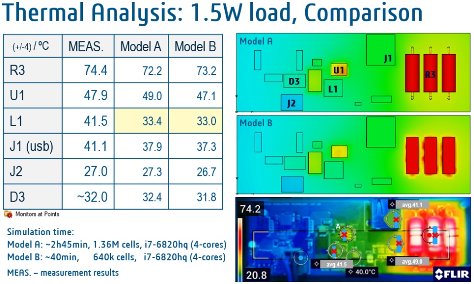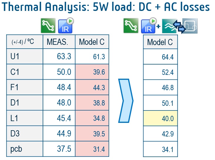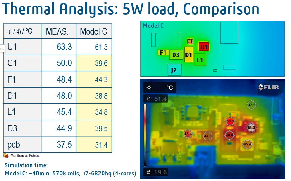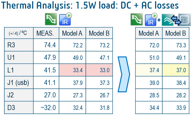 Applying a co-simulation to the analyzed PCB leads to the results shown in Fig.7, with agreement between measurement and simulation results is reached. The temperature of the system inductor (L1) slightly exceeds the maximum tolerance, mainly because of the unknown material used for its core.