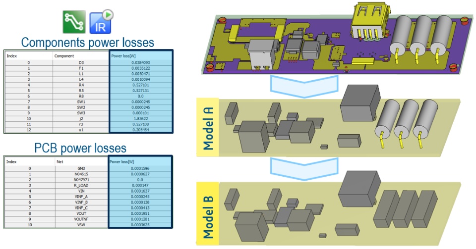 This analysis considers a PCB without any enclosure. In order to keep the model preparation stage as simple as possible, all necessary data needed to engage a thermal simulation is obtained from an IR-Drop analysis (e.g. heat sources, thermal losses of a PCB, geometry of the PCB components).