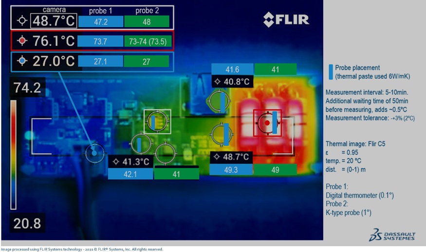 The measurement is performed with help from thermal imaging (a thermal camera) and two probes (a K-type thermocouple probe and an indoor thermometer) in order to validate the read-out. Utilization of the probes is essential to obtain and determine an accurate value of tested device emissivity and ambient temperature for thermal imaging purposes. Based on the acquired temperature values, an average temperature is calculated for all measuring points. The probe locations are shown in Fig.5.