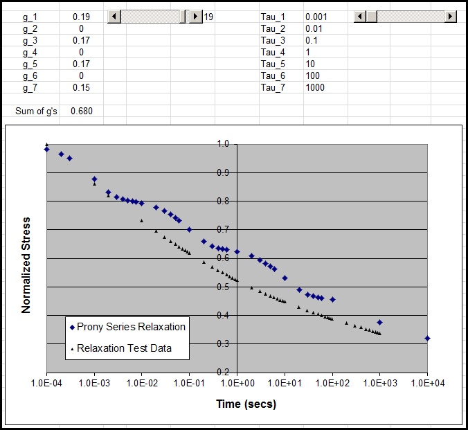 In the video, a comment was made that if too few Prony terms are used the response will look 'bumpy', or 'wavy'. In the image below we have used the spreadsheet (attached and downloadable) and given only 4 Prony terms (pairs of g's and tau's) over 7 decades of time - roughly one pair per 2 decades of time - and you notice the bumpy or wavy response of the Prony model (blue diamond symbols).