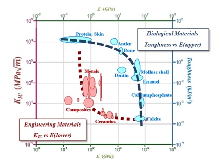 The “banana curve” for stiffness (X-axis) versus toughness (Y-axis) for engineering materials (on lower and left axes) and biological materials (on upper and right axes)