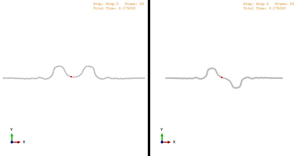 Two traveling waves meet in the middle. In one case, both waves are up. In the other case, one wave is up and one wave is down. The red node is in the middle. The dynamic simulation is in Abaqus/Standard. It uses the moderate dissipation integration scheme. The structure is composed of point-inertias elements joined together with axial connector elements with nonlinear stiffness and linear damping.