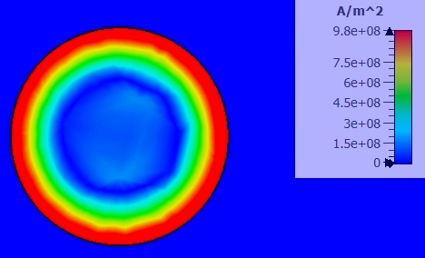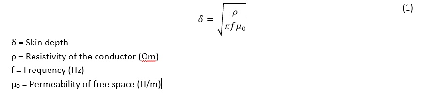 When an alternating current flows at high frequencies in a solid wire, there is a redistribution of the current within the conductor. The current density is largest near the outer surface of the conductor and decreases exponentially toward the inner axis of the conductor. This redistribution is the skin effect. The expression for the skin depth δ is given in (1) and its effect is shown in Figure 1. The outer red cross-section in Figure 1 carries the highest current magnitude while the central blue section carries the lowest current magnitude, which is due to redistribution of current flow inside the whole cross-section of the conductor. The skin depth, δ, is therefore the depth where the current density is 1/e of the value at the surface.