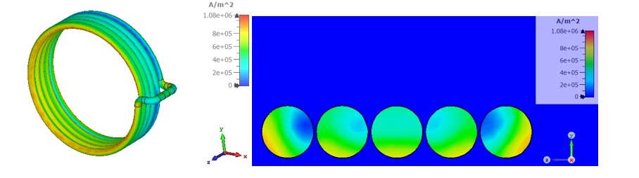 Another significant issue to consider when using litz wires is the proximity effect due to the closeness of packed wires. The proximity effect also causes a redistribution of currents within the conductors and hence an increase in AC resistance, resulting in an increase in heat losses. Figure 2 shows how the proximity effect affects current distribution in a coil with five turns. Figure 2 (a) shows the full coil, and Figure 2(b) the current distribution in the cross section. Twisting the wire strands into a bundle using an appropriate lay length and number of twists can help reduce the losses due to the proximity effect, but does not eliminate them. Hence, we must also consider them.