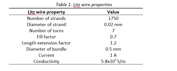 The coil is defined using ‘Coil Segment’ option and hence is by default an open coil loop. To have a divergence-free current in the coil, it must be closed either using a perfect electric conductor (PEC) or using the boundaries of the model. In this case, PEC is used as material to close the loop, as shown in Figure 3. This does not affect the losses in the model, but the PEC material can later be changed to a more realistic one to represent the electrical connector between the two wire ends. Once the coil is created, the properties can be defined in the dialog box, as shown in Figure 5. Table 1 provides more details on the litz wire coil used in this example.