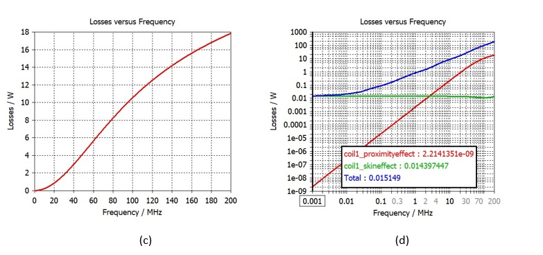 The model is solved for a frequency range of 50 Hz to 200 MHz, and the results for each frequency point can be found in the navigation tree, as shown in Figure 6(a). The main results of interest, skin and proximity losses, can be found under 1D Results/LF Solver/Losses. In this example, the losses in the ferrite C-core are also available. Figure 6(b), 6(c) and 6(d) show the skin, proximity and total losses respectively.