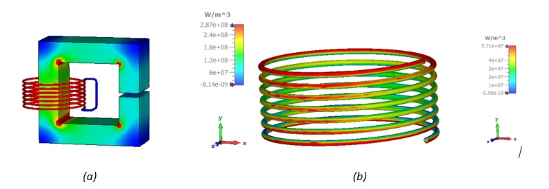 Figure 7(a) shows the magnetic loss density in the complete model at 100 MHz, while Figure 7(b) shows the loss density in the coils only, dominated mostly by the proximity effects. Despite the losses being much higher in the ferrite core, the loss density is much higher in the coils due to the smaller cross-sectional area.