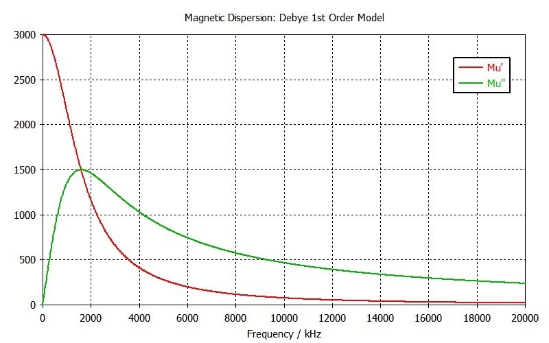 The relative magnetic permeability of the ferrite core is set to 200, and it has dispersive magnetic properties, as shown in Figure 4. This allows the calculation of the frequency-dependent magnetic losses in the C-core, which are not discussed in more detail here as it is beyond the scope of this paper.