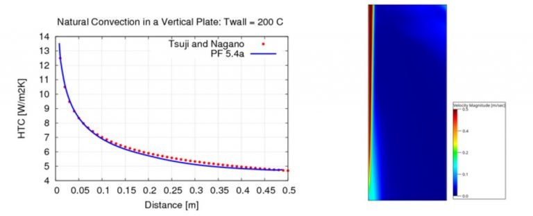 In figure 8, on the left, we compare the heat transfer coefficient on a vertical plane as a function of vertical distance with experimental data from [2] and observe good agreement between simulation and experiments. On the right, we observe the natural convection-driven velocity field for the vertical plate.