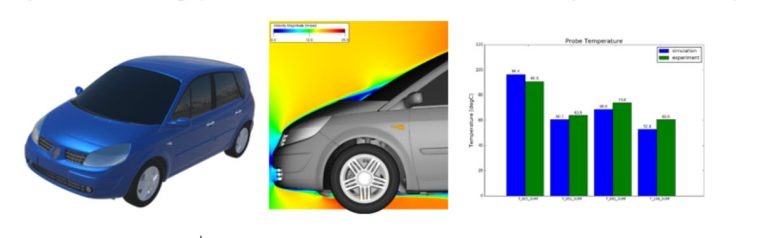 In figure 9, we compare thermocouple measurements for the Renault Scenic 2 vehicle with simulation results documented in [3]. We observe a good correlation as shown in the bar chart on the right. On the left, we show the image of the test vehicle, and in the middle, the velocity field in the y plane.