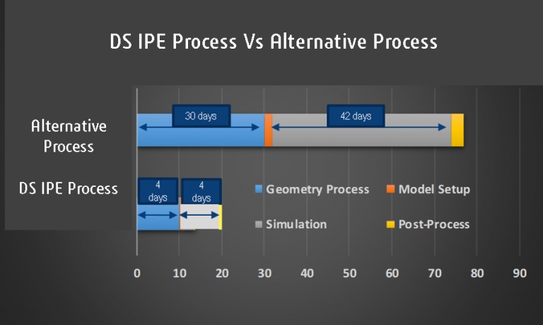 In figure 7, we compare the turnaround times for the Dassault Systèmes process and an alternative competitor process. We observe that the turnaround time for both the geometry and simulation process is significantly faster with the Dassault Systèmes process. The key enabler is using the exact vehicle geometry with no simplifications since the PowerFLOW solver has the robustness to handle complex geometries. For an alternative process, an approximate geometry is necessary, otherwise, the simulation runs the risk of solution divergence. For the simulation turnaround time, PowerFLOW runs significantly faster for transient simulations than the alternative process.