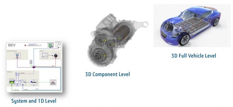 In figure 2, we see different levels of the virtual vehicle model, each representing operational aspects of the vehicle at a certain stage of its development. A system and 1D model applies to the early design stage in which design and basic vehicle layouts and functional specs are evaluated. At a later stage, we build virtual models that represent vehicle components at a 3D level with an exact geometrical representation. These virtual models are used in the construction and prototyping phase.