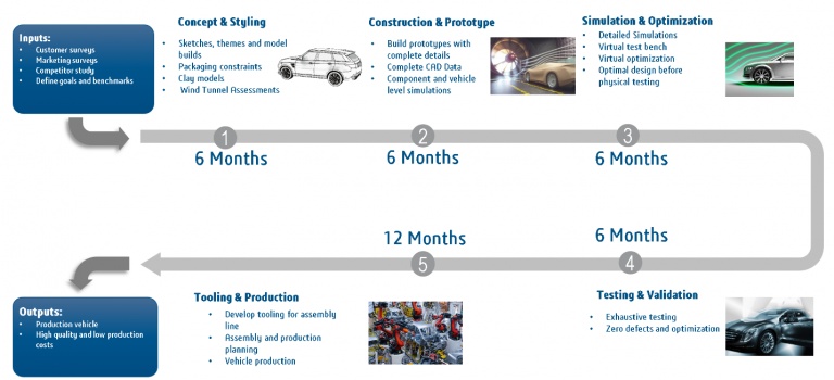 Vehicle development is a very time-consuming process. The total time from concept to production is typically three years. However, the time depends on the vehicle model and can range from three to six years. The design process is expensive, with costs up to four billion Euros.