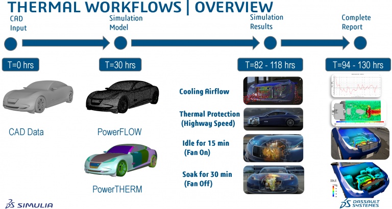 Figure 6, shows validated Thermal workflows that simulate standard testing procedures automotive OEMs use for product development. With automated tools, the total time from CAD to complete a report requires less than six days for all workflows and thus provides significant savings to the vehicle design process in both turnaround time and cost.