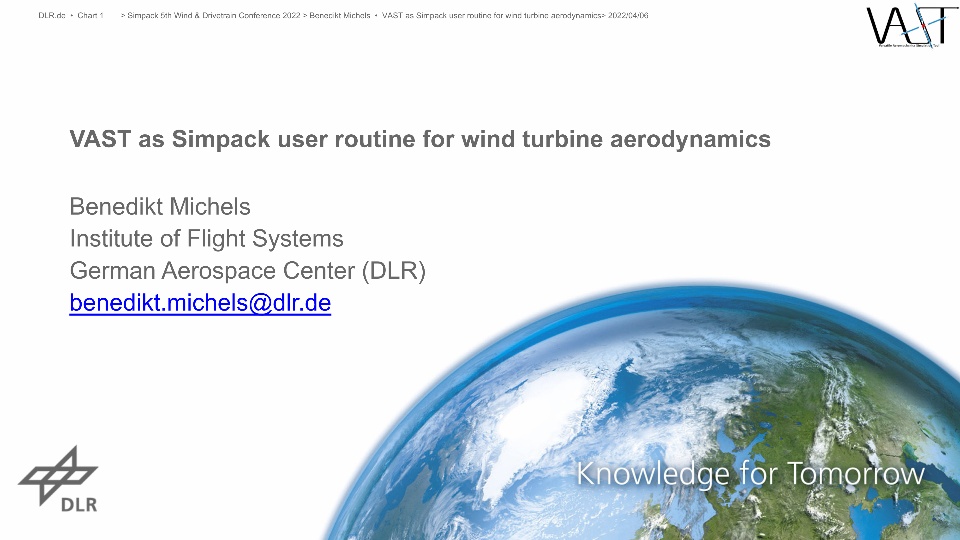 The presentation gives an overview of the emerging wind turbine simulation capabilities at the Institute of Flight Systems of the German Aerospace Center (DLR), using Simpack in combination with the in-house aeromechanics code VAST (versatile aeromechanics simulation tool).