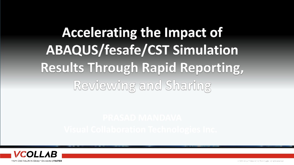 Abstract: Across all industries there is a change driving companies to increase the utilization of simulation in their product development processes. Cost and time pressures are leading companies to significantly reduce, or in some cases eliminate physical testing. To compensate for the loss of information that testing has provided over the years organizations are turning to simulation to fill the gap in delivering critical design insight. This means that the number of simulation studies must increase dramatically while there sources available to perform these studies do not increase proportionally. The result is that old, traditional processes of post-processing and reporting simulation results must be replaced with new, innovative approaches and technologies. Abaqus/fe-safe/CST have been and continues to be a critical resources for companies in their simulation strategy. And now new technologies are available to increase the impact these Abaqus/fe-safe/CST results can provide in this new environment of increased simulation studies. These increases are accomplished by accelerating the understanding, sharing, and collaborating around CAE results. This presentation will detail the specific capabilities within VCollab that both streamline, and in some cases eliminate the traditional tasks that analysts face in the post-processing, evaluation, reporting and sharing of Abaqus/fe-safe/CST results. The areas of focus include:1.Full 3D, WEB-based, interactive access, viewing & reviewing of key simulation results & insights, allowing analysts, engineers, chief engineers, and requirements engineers to review, discuss, and gain insight for faster designdecisions.2.Smart tools to extract highly reduced results files that maintain the key simulation data without the large files sizes associated with the native CAE results leading to increased collaboration and sharing. And creating a common file format for these compact files unites simulation information across multi physics domains.3.Smart tools to quickly extract valuable insights from Abaqus/fe-safe/CST results(such as hotspots or potential areas of concern) and provide advanced visual(dynamic, 3D, and real-time) communication with all stakeholders. Together, these capabilities enable users to fully experience the benefits of simulation by allowing them to quickly understand and analyze ABAQUS/fesafe/CST data, as well as make faster and more informed design decisions with the highest confidence and quality. This will pave the way for effective communication and collaboration among the engineering teams. This also allows for increased productivity, along with maximizing both the effectiveness of existing CAE resources, and the utilization of simulation results.These new class of tools and technologies from VCollab are at the heart of digital transformation of the process of simulation. These VCollab tools & features seamlessly work with the ABAQUS/fesafe and CST files, enabling smart WEB-based simulation results viewing and review solution. In conjunction with Abaqus/fe-safe and CST, we will outline how these capabilities can assist product development teams in moving from analysis results to high-quality design decisions by reducing the time of some simulation processes by as much as 90% leading to increased speed, efficiency, and accuracy in simulation-led decision making.