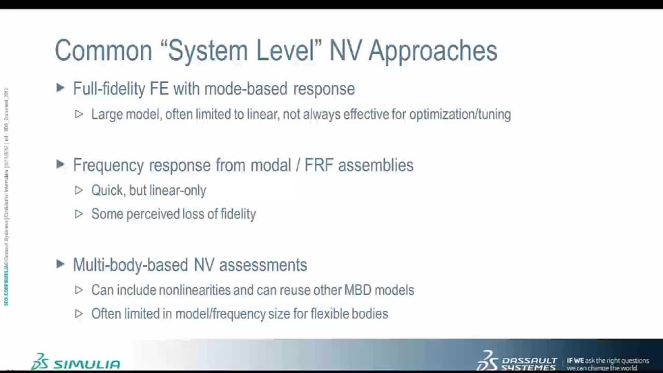 Noise, Vibration and Harshness is a commonly used but often misunderstood term. Often companies have multiple software deployed to solve NVH. This e-seminar recording will explain the expansive nature of NVH, why different approaches are necessary, and what offerings SIMULIA has to help you solve your NVH problems.