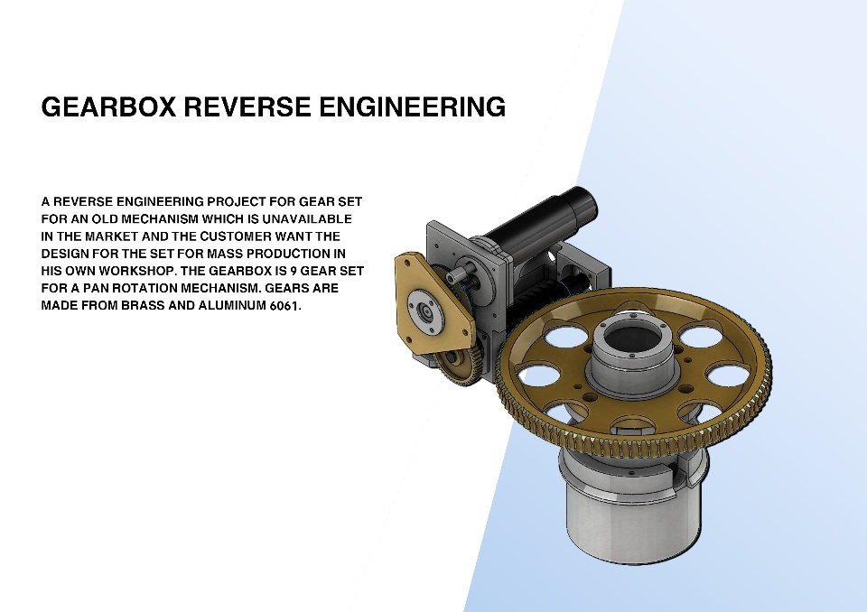 A reverse engineering project for gear set for an old mechanism which is unavailable in the market and the customer want the design for the set for mass production in his own workshop. The gearbox is 9 gear set for a pan rotation mechanism. Gears are made from brass and aluminum 6061.