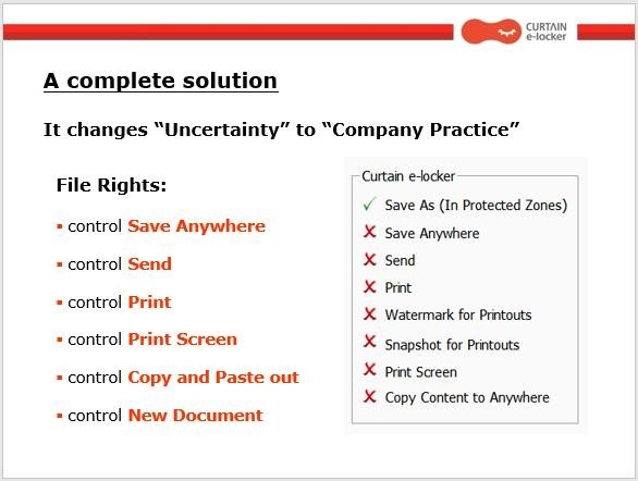 Curtain e-locker is an Information Rights Management system that prevents confidential files from leaking out of the company. It allows users to access confidential files as usual, but not to print, screen cap, copy, save as, or send files to external sources if they are not authorized to do so.