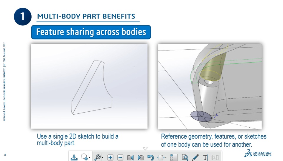 When designing complex, plastic, or mating components, using multi-body parts can save time and provide flexibility. This presentation covers the various benefits of a multi-body approach, discusses how to handle configurations and file relations, and explores some of the tools available in SOLIDWORKS® to help your designs take shape. Check it out!