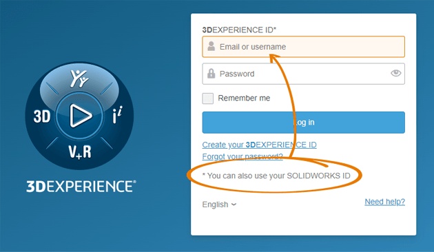 Note: To log in using your 3DEXPERIENCE ID, use the same email address and password you currently use for your SOLIDWORKS ID today.