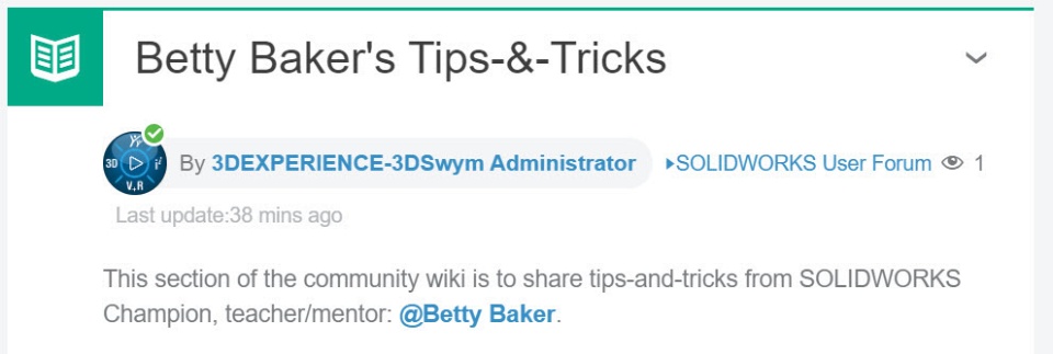 In honor of @BB having the honor to be featured on The Core Podcast (listen into the Dec 2023 pod here), we are proud to be releasing a treasure trove of Betty's favorite SOLIDWORKS Tips-and-Tricks in the SOLIDWORKS User Forum's, "User Generated - SOLIDWORKS Tips/Tricks/FAQ" in this new branch: Betty Baker's Tips-&-Tricks