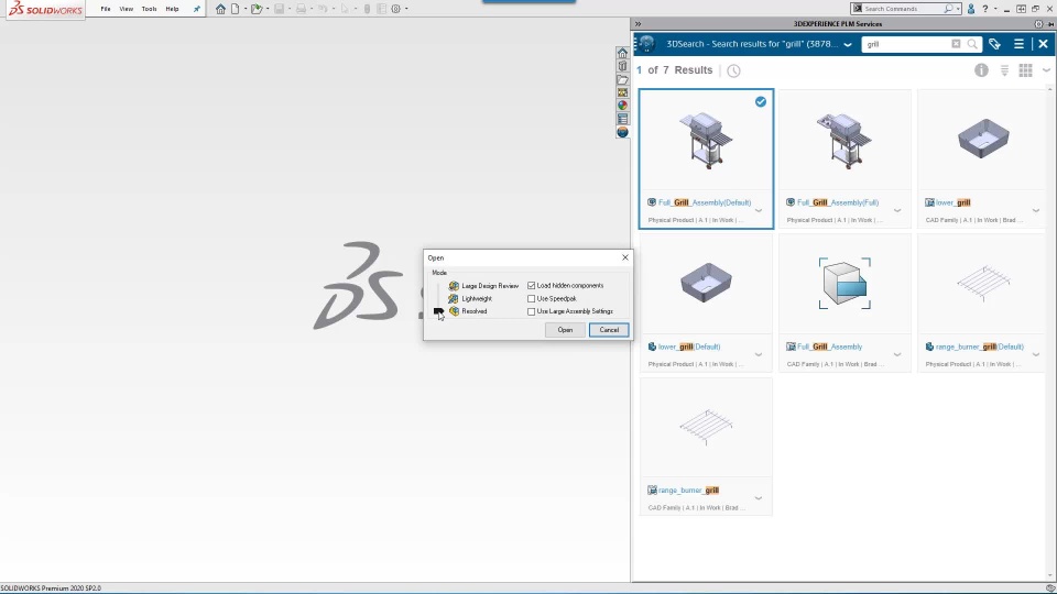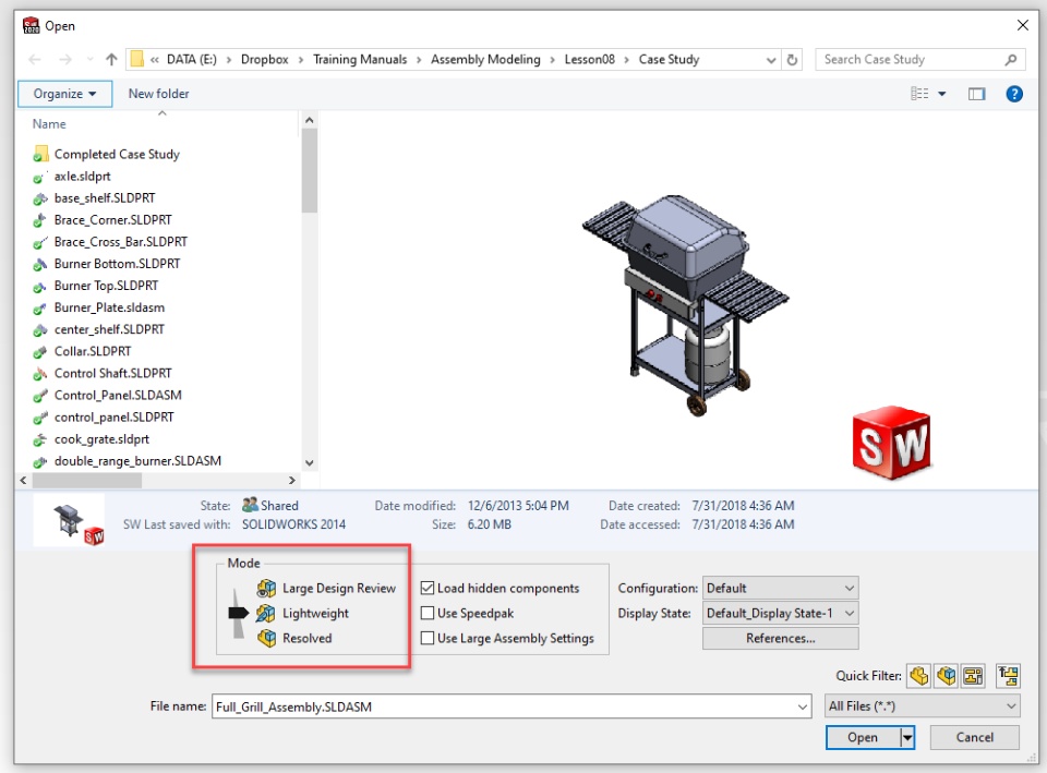 One of my favorite features in SOLIDWORKS is the Open modes that are available in the File>Open dialog. This way, I can choose up front how I want to load my assembly: Resolved vs. Lightweight vs. Large Design Review.