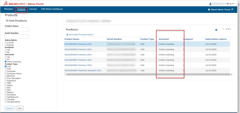 We recommend that you contact your SOLIDWORKS Administrator to plan ahead and work with them to switch your licenses back to machine activation - directly from the SOLIDWORKS Admin Portal - before the phase-out date. Administrators can identify the products configured to use online licensing in the Products tab by doing the following: Under Activated, check the Online Licensing filter and click Search.