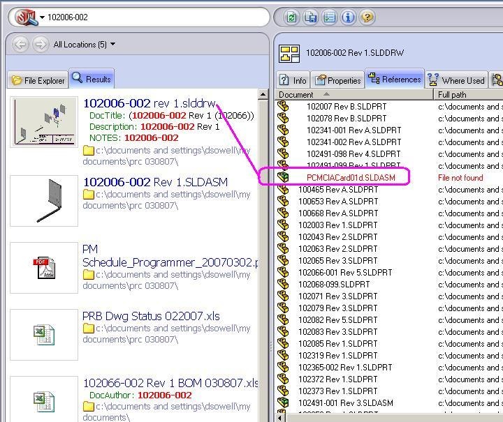 However, in the 2007 SW Explorer screenshot, same Drawing, a "NotFound Reference" is shown. Even after the Drawing and it's Childrenare Rebuilt and Saved and the Explorer View Refreshed. Yes, at onetime this Reference existed, but it has been removed all the way tothe Sketch/Feature level. This is verified in SolidWorks, File,Find References.
