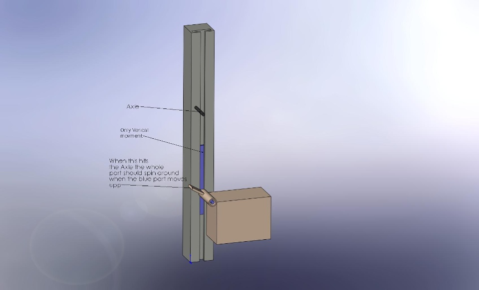 I need to be able to visualize a movement in an assembly.Look at the picture, the blue part is pulled up in the column. Whenthe brown part hits the axle it starts turning around it as long asthe blue part is moving up.