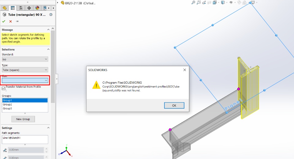 I have a weldment sketched part and I have downloaded the ISO pack from within the software. When I choose any ISO > Tube (Square) the size drop down won't let me select anything and this dialogue opens.