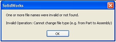 This has happened a couple of times now so I wanted to see ifthere was a fix. When I try to change the file reference of a partdrawing, it shows the old part as a .sldprt file but shows thesymbol for an assembly. Then when I try to replace it with anotherpart, an error messages says "invalid operation: cannot change filetype (eg from part to assembly)"
