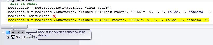 The pic shows the code I'm running, and the red-X shows the linethat 'should' delete the sheet. But after executing that line, itgives me the warning that the sheet couldn't be deleted ?