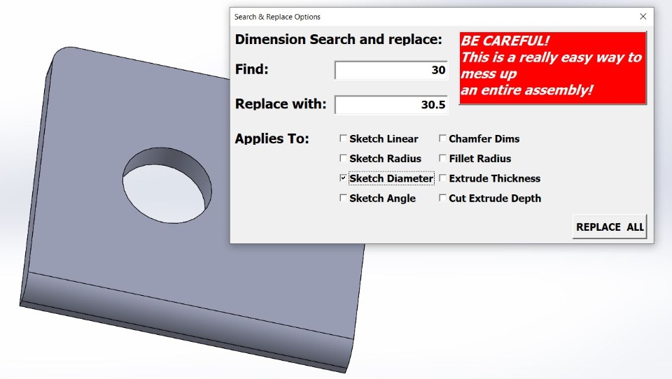 I have a large assembly (over 1000 parts) and I needed to change the hole size on all the parts - and there's tens of thousands of instances of it!