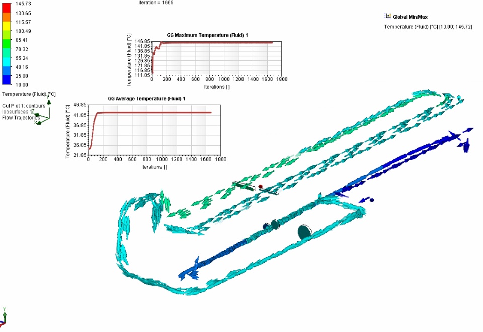Can anyone tell me why the flow simulation is giving me such high max fluid temp? The only space/place where fluid is running is shown in this flow trajectory. While min fluid temp as shown on top right is 10C as it should based on the fluid input and the output-supposedly the hottest-should be about 85C looking at the exit per trajectory color..