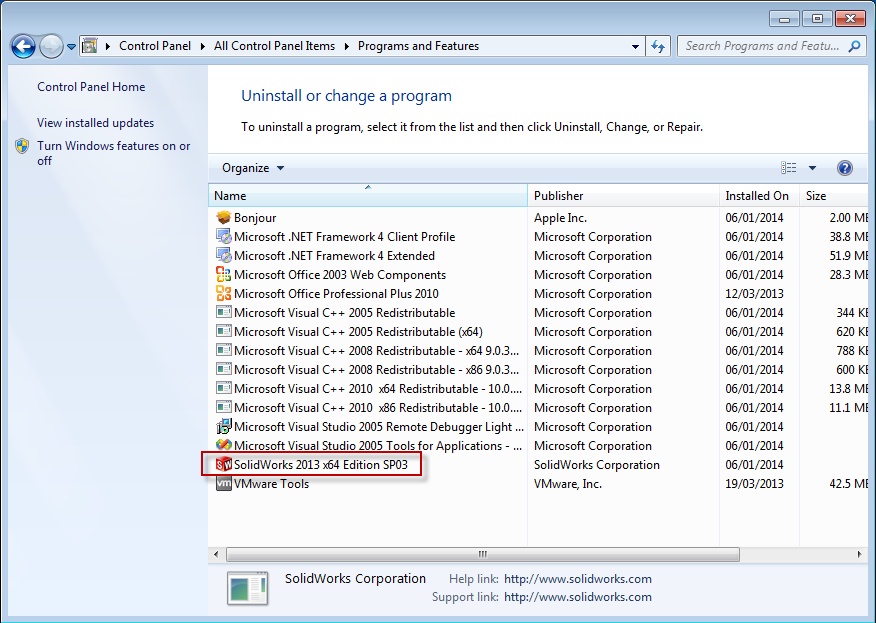 To do this, open your Windows Control Panel from the Start Menu, select the "Programs and Features" item, then locate SolidWorks in the list of programs. Make a note of the version and service pack number, then close the Control Panel window without making any changes.