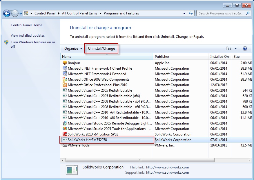 Open your Windows Control Panel from the Start Menu, select the "Programs and Features" item, then locate the item SolidWorks Hotfix 752978 and click Uninstall.