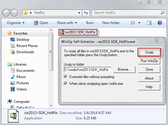 Double-click on the hotfix sw201x_SP0x-SDK_HotFix.exe. A WinZip Self-Extractor should appear. Click “Unzip”.