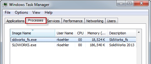 Verify in the Task Manager that sldworks.exe and sldworks_fs.exe processes aren’t running. To do this, open your Task Manager by pressing “Ctrl + Alt + Delete” at the same time and select Start Task Manager. You will then see the window below.