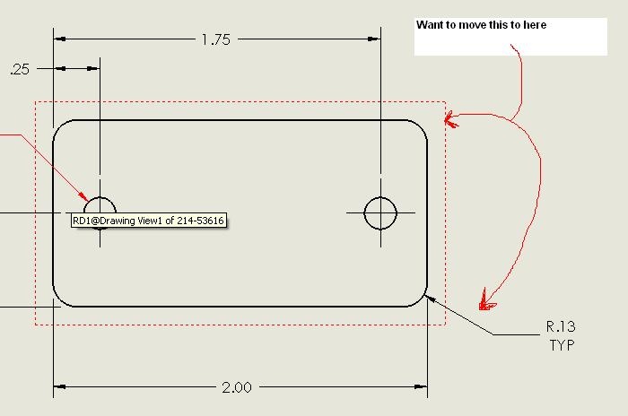 Does anyone know how to move a radius dimension (from afillet) from one corner to another in the same view? Please see mypicture for clarification. Does the dimension get attached to thefirst edge selected in the model?