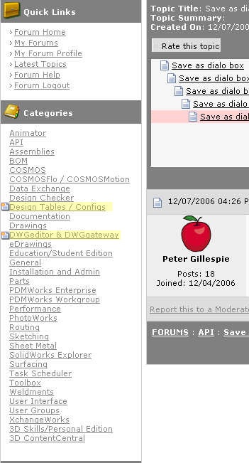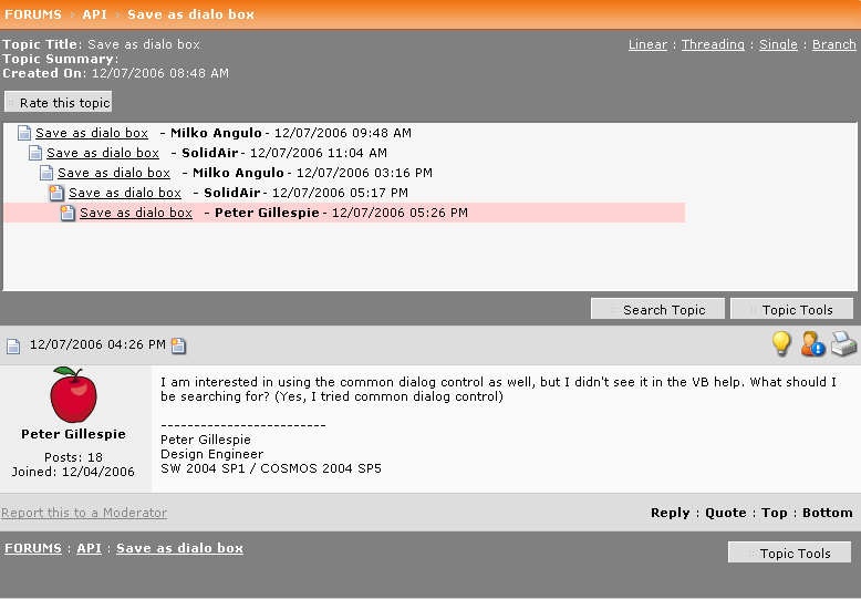 Now maybe I'm not seeign it, but I have no way to tell whatI've read or not read in a topic thread and find my self having toscroll through the entire thread to catch the "latest topics". Ihave Threading selected as the view, but this list still is notdistinguishing the newest posts from those I've already read, andonce your down scolling in the posts you can't see the threadstructure and I'm lost as to who is replying to who. For aninterface that is supposedly much more "graphic" than the oldforum, I find that it is not using graphics to show organization.This is poor design. Good graphic design lays out informationintuitively. I'm feeling like I'm in a house of mirrors herewithout a compass and I'm afraid my participation here is going tofall way off because I'm finding navigating through here such ahassle; much harder than the old layout.SolidworksGeneral