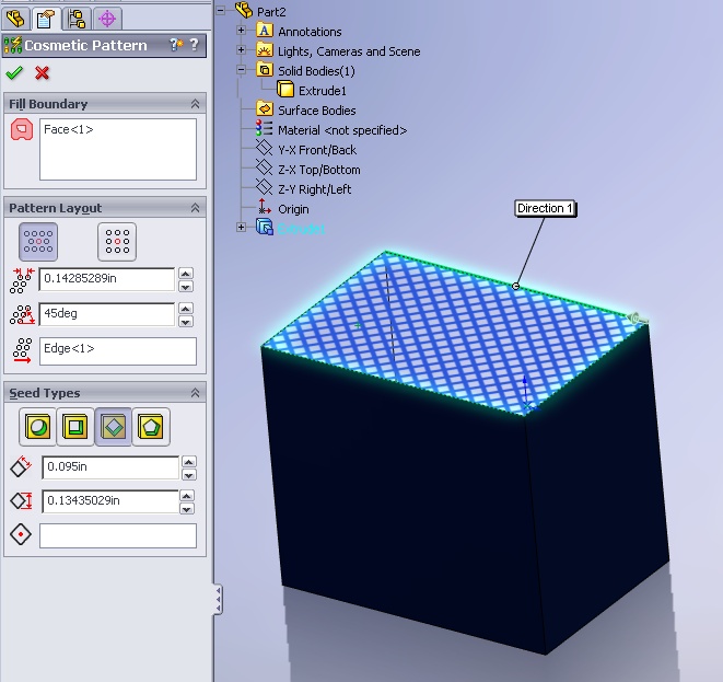 My system(Dell 690 workstation w/ Quadro FX 3500 GC)bogs down andeven crashes when trying to create this detail over 5" squaresurface. I have tried linear pattern in the sketch and after thefirst cut. Both have similar results- shuts down SW.