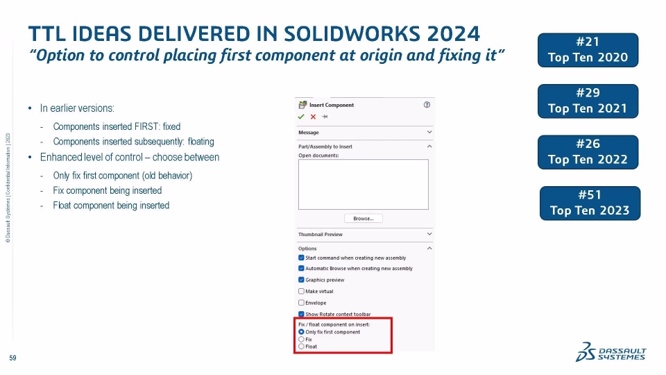 SOLIDWORKS has always been a customer driven product. Enhancements to SOLIDWORKS products are driven from feedback obtained through direct customer research, analysis of our many internal databases of customer information, reviewing feedback from our many public forums and of course direct customer request for enhancements - like the ideas submitted to the The Top Ten List - 3DEXPERIENCE World 2024.