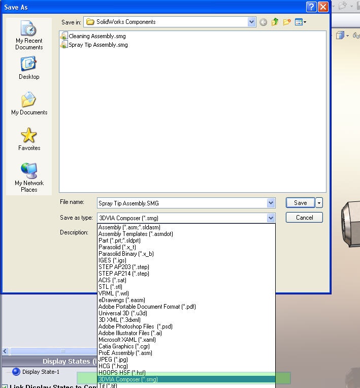 When you have "3DVIA SolidWorks Plug-in" installed, you can saveSMG file from the 3DVIA Composer menu as well as withinFile-->Save As dialog.