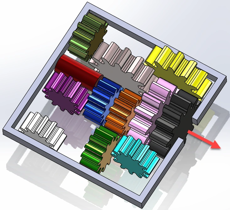 - Move the gears around until the red shaft is free to exit the gear box