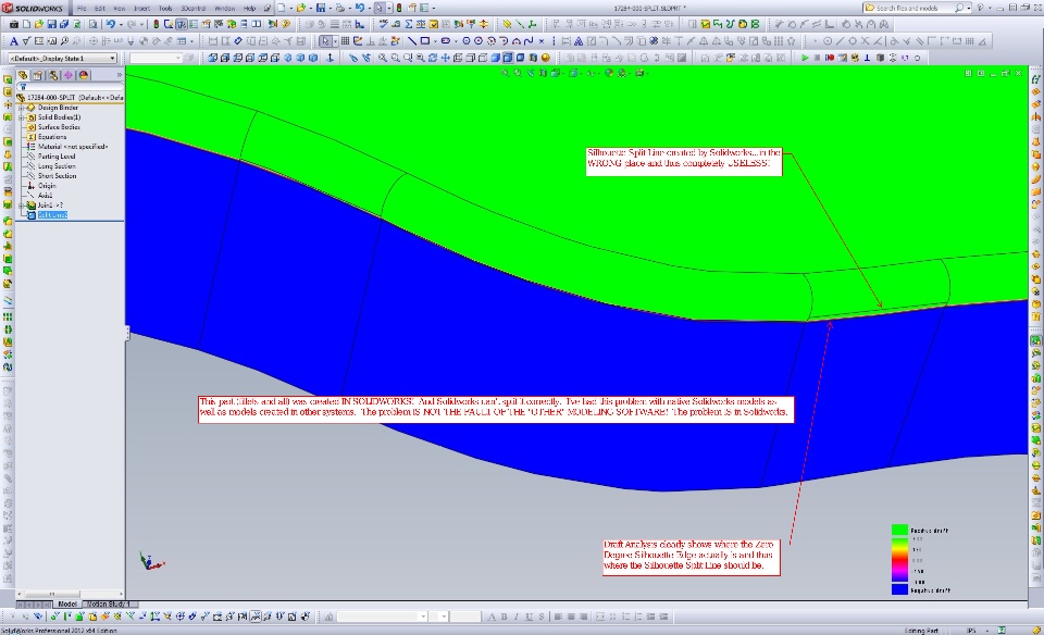 I've been fighting this problem for 12 years. Solidworks can't make a proper split on the silhouette of a fillet/radius/round, at least not consistently. Anybody else have problems with this? Draft Analysis shows that the split should be clean and continuous yet SW will often "jog" the split, making it useless. I have this problem with native SW models and with models from other software...doesn't matter what system modeled the part, SW can't split correctly (even though it shows the "zero degree edge" correctly in Draft Analysis).