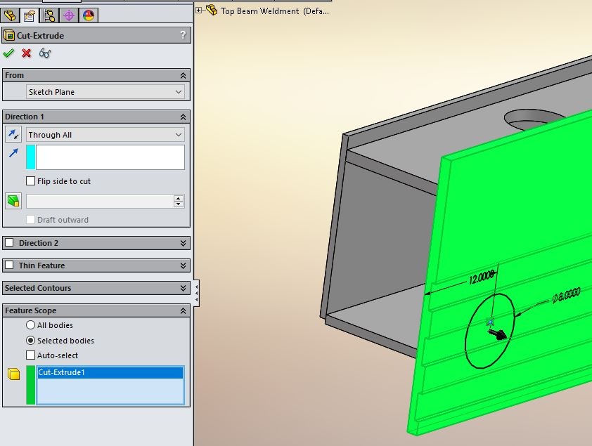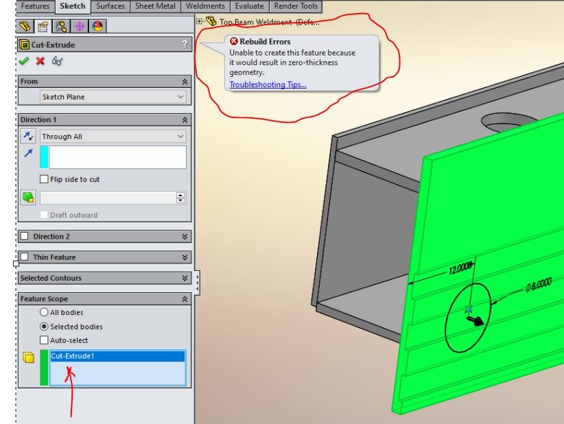 Hello All. I'm sure this issue has been mentioned alot in the past but I'm not sure the best solution to get around it and achieve what I need. Gotta be a simple workaround I hope. I need to apply a simple extrude cut in a plate but get the error attached. I am choosing only the only body so the hole doesn't go into any other bodies. I've tried locating the sketch on different planes and changed the direction as well as "blind, through all, etc" to no avail. I have the circle sketch on the back face of highlited plate and hoped I can do an extrude cut outward with "through all" but get the error in 2nd pic. The hole can only be in the big plate - must I remove some material from the plate directly behind so there is no interference? Any help is appreciated! Tried attaching part but it says "not supported" for the common .sldprt when I try to upload - this new format confuses me :). Thanks in advance.